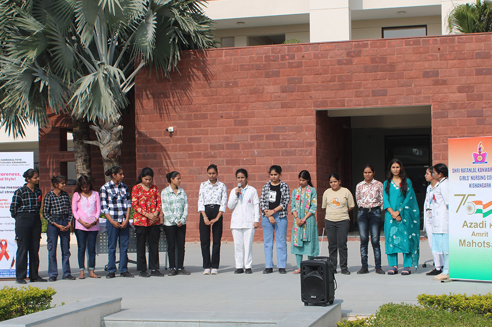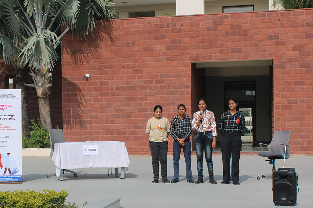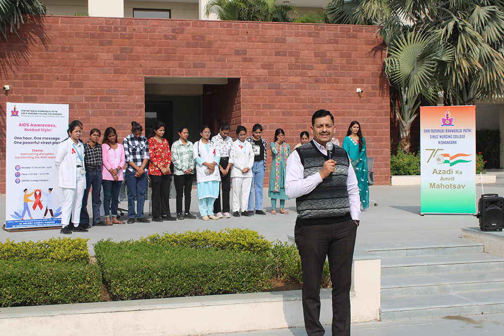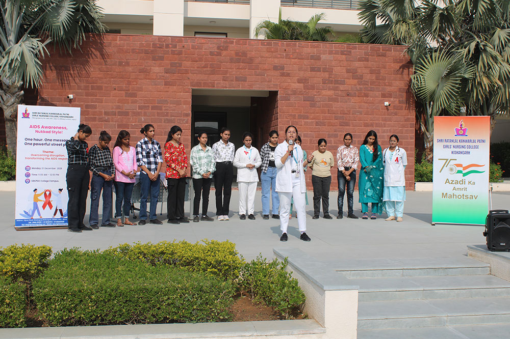 On the Occasion of World AIDS Day on 1st December 2025, Department of Medical Surgical Nursing Shri Ratanlal Kanwarlal Patni Girls’ (Nursing) College, Kishangarh, organized Nukkad Natak (Street Play)under the guidance of Assistant professor Ms. Barkha Sharma & Mr. Anurag Sharma. The global theme of AIDS Day 2025 is “Overcoming Disruption, Transforming the AIDS Response,” The event aimed to enhance awareness among college students regarding HIV/AIDS, its prevention, early diagnosis, and the importance of eliminating social stigma.